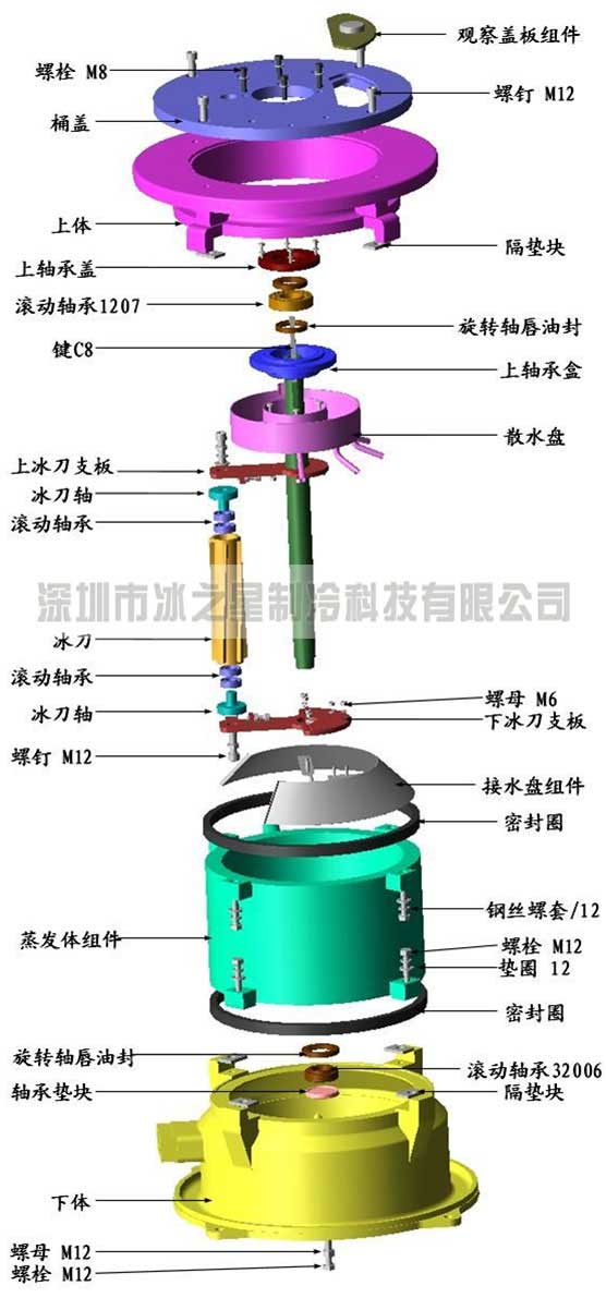 (2)布水原理:外接水管(自來水)→浮球閥(控制水量)→水箱→抽水泵→管路→分水盤(由主軸帶動其旋轉)→均勻噴在蒸發桶內壁上(一部分經熱交換成冰)→下體水槽(多余的水)→水箱