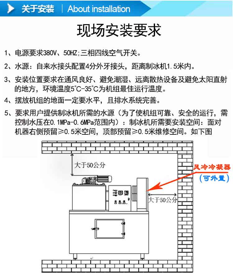 如果室內(nèi)通風(fēng)散熱效果不好,也可以做成分體式,可以把機(jī)組的風(fēng)冷冷凝器或制冰機(jī)組把安裝在室外進(jìn)行散熱。