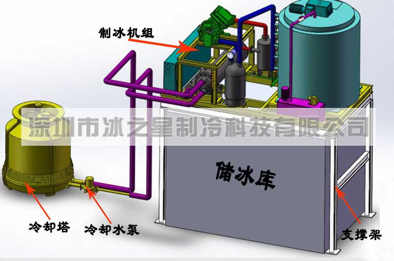 大型片冰機(jī)的冷卻方式一般為水冷方式,需要在安裝現(xiàn)場(chǎng)對(duì)冷卻水塔、冷卻水泵及儲(chǔ)冰庫(kù)進(jìn)行安裝,這個(gè)需要專業(yè)安裝師傅進(jìn)行現(xiàn)場(chǎng)安裝或指導(dǎo)安裝。大型片冰機(jī)安裝示意圖如下