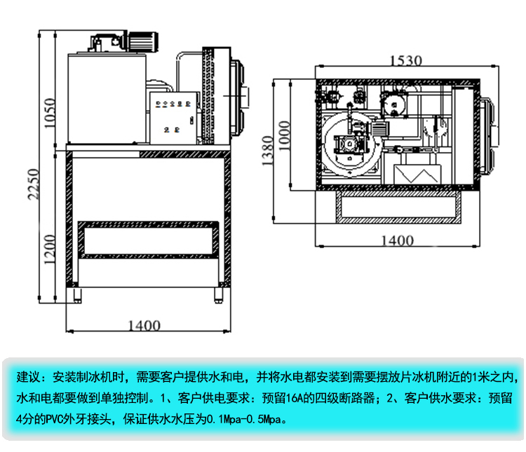 | 10 | 制冰機外型尺寸(長*寬*高) | 1530*1000*1050 mm | 凈尺寸 |