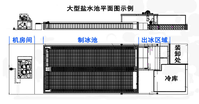 鹽水池塊冰機設備主要包括制冰機組、制冰鹽水池、冰桶及冰桶架、融冰池、倒冰架、加水器、吊冰車組成。