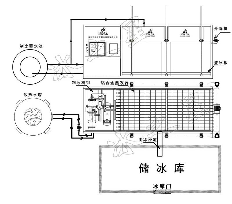 F、脫冰迅速快:水凍結成冰后,制冰系統反向加熱,熱氟進入蒸發器脫冰,脫冰速度快;脫冰后直接落在冰輸送裝置上,無需行車等取吊設備;